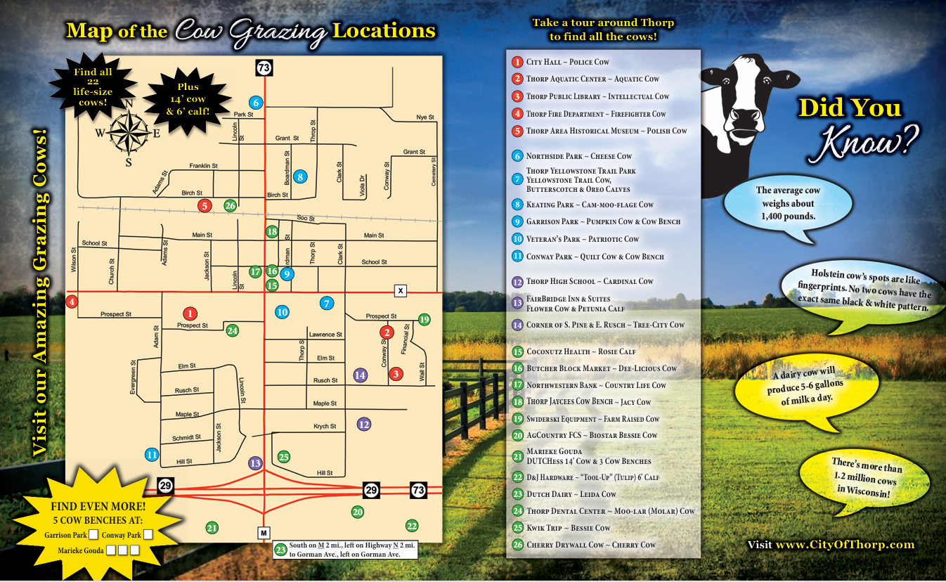 - Visit one of Thorp's local restaurants or businesses and pickup a Community Guide. Head to page 10 and find the map and checklist for all of our cows.